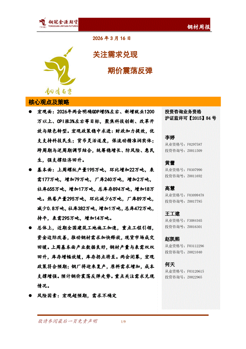 铜冠金源期货-钢材周报:关注需求兑现,期价震荡反弹-260316