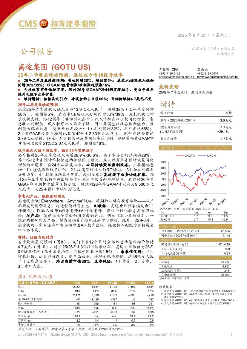 高途集团:招商证券(香港)-高途集团-GOTU.US-25年二季度业绩超预期;通过减少亏损提升效率-250827