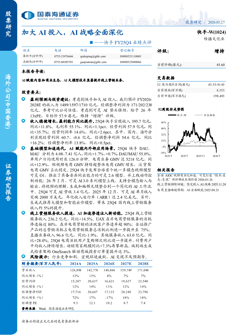 快手~W:国泰海通证券-快手~W-1024.HK-FY25Q4业绩点评:加大AI投入,AI战略全面深化-260327