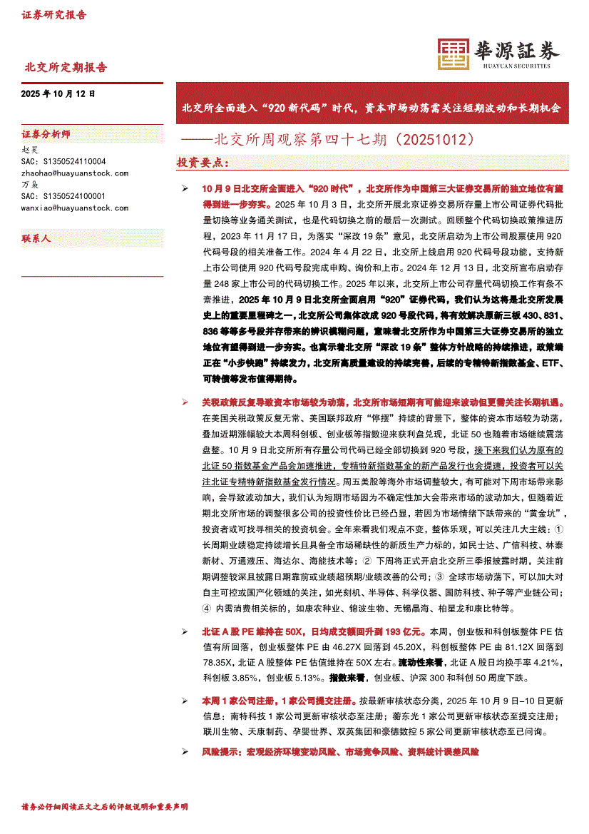 华源证券-北交所周观察第四十七期:北交所全面进入“920新代码”时代,资本市场动荡需关注短期波动和长期机会-251012