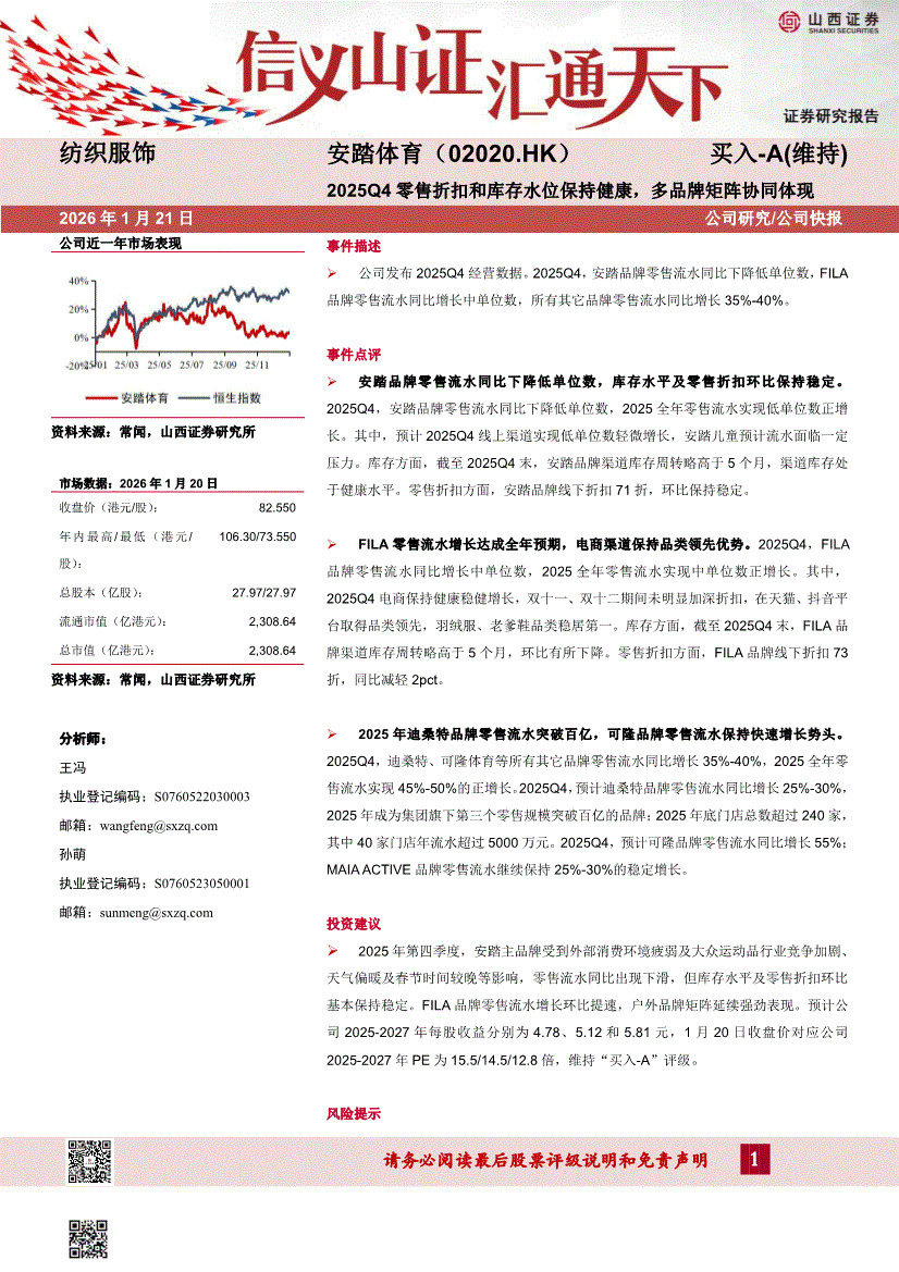 安踏体育:山西证券-安踏体育-2020.HK-2025Q4零售折扣和库存水位保持健康,多品牌矩阵协同体现-260121