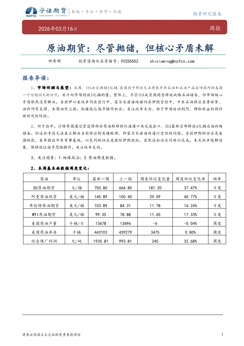 宁证期货-原油期货:尽管抛储,但核心矛盾未解-260316