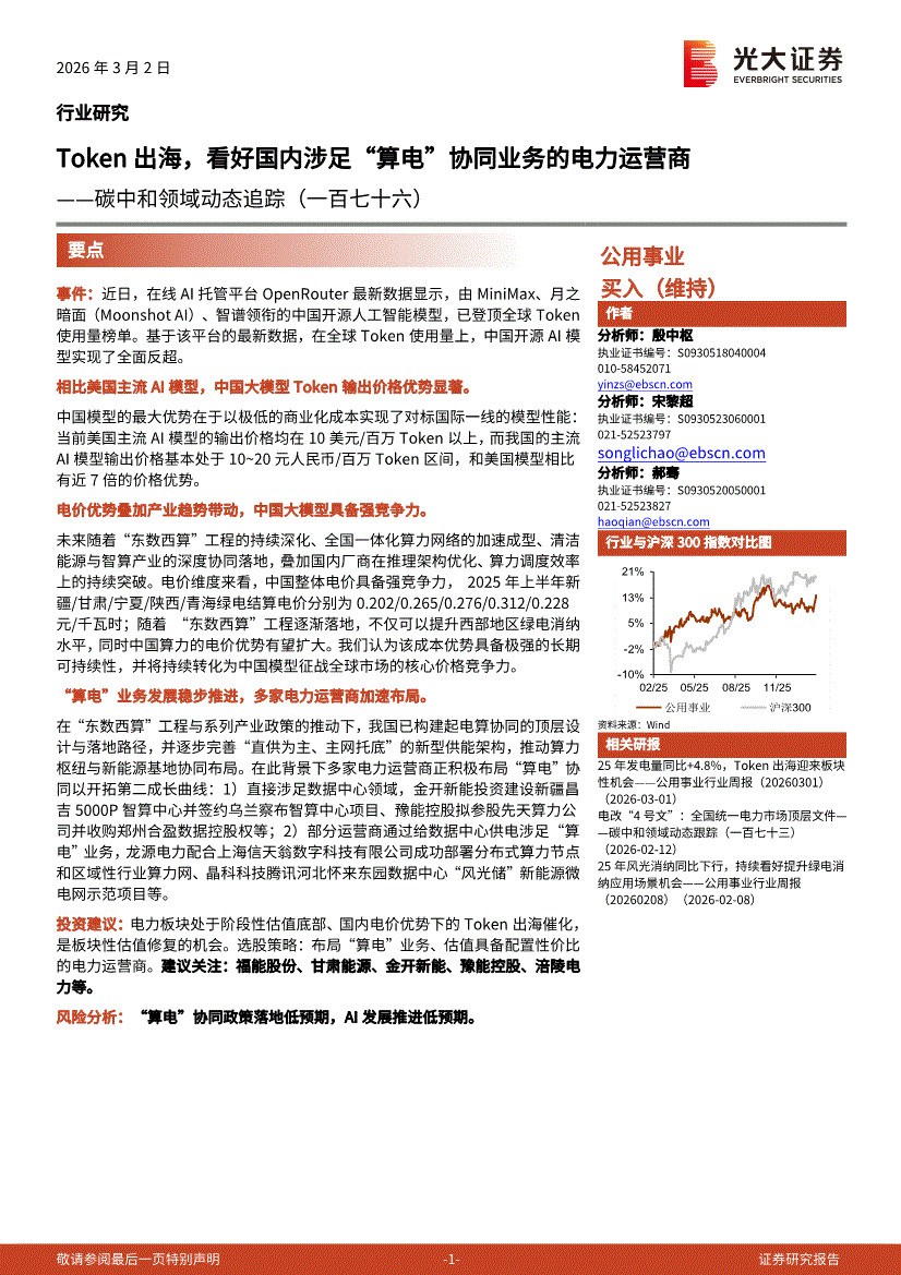 公用事业行业:光大证券-公用事业行业碳中和领域动态追踪(一百七十六):Token出海,看好国内涉足“算电”协同业务的电力运营商-260302