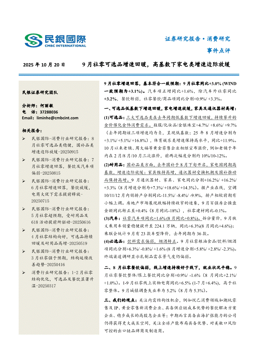 消费行业:民银国际-消费行业研究事件点评:9月社零可选品增速回暖,高基数下家电类增速边际放缓-251020
