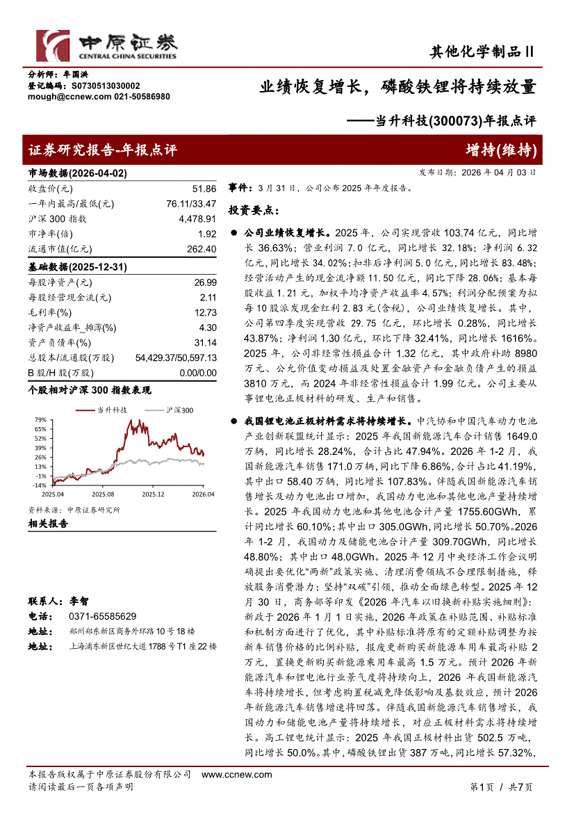 当升科技:中原证券-当升科技-300073-年报点评:业绩恢复增长,磷酸铁锂将持续放量-260403