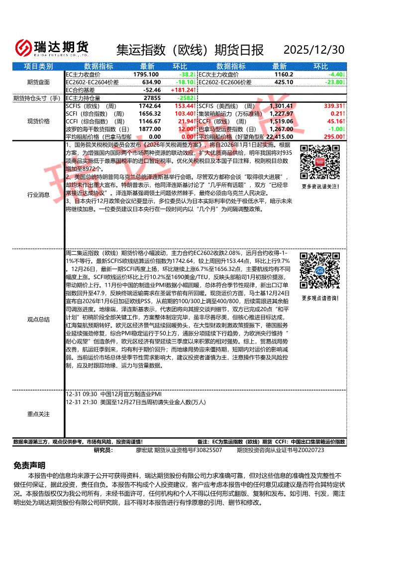 瑞达期货-集运指数(欧线)期货日报-251230
