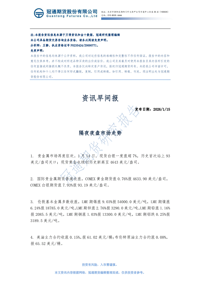 冠通期货-沪铜日报:铜盘面高位调整-260113