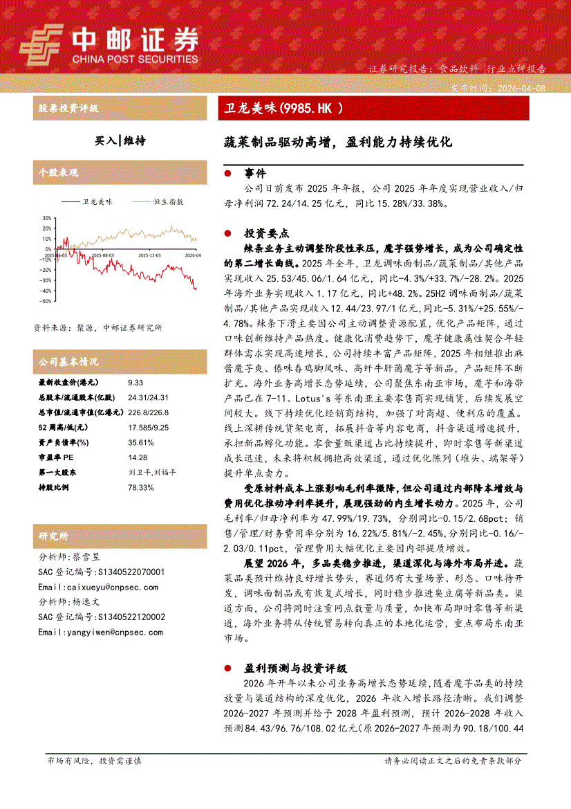 卫龙美味:中邮证券-卫龙美味-9985.HK-蔬菜制品驱动高增,盈利能力持续优化-260408