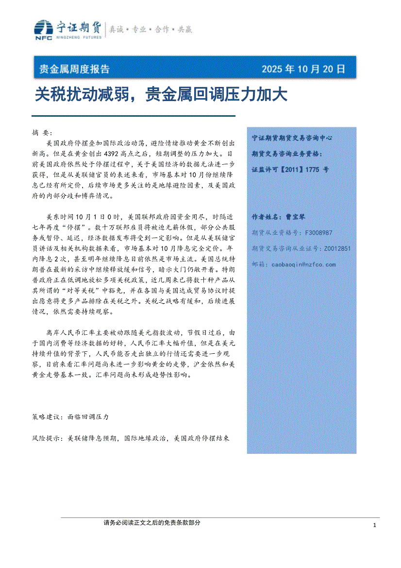 宁证期货-贵金属周度报告:关税扰动减弱,贵金属回调压力加大-251020