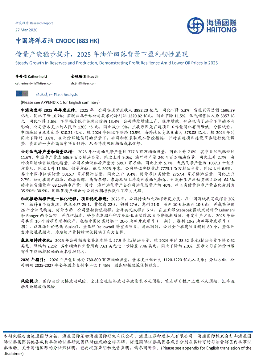 中国海洋石油:海通国际-中国海洋石油-0883.HK-储量产能稳步提升,2025年油价回落背景下盈利韧性显现-260327