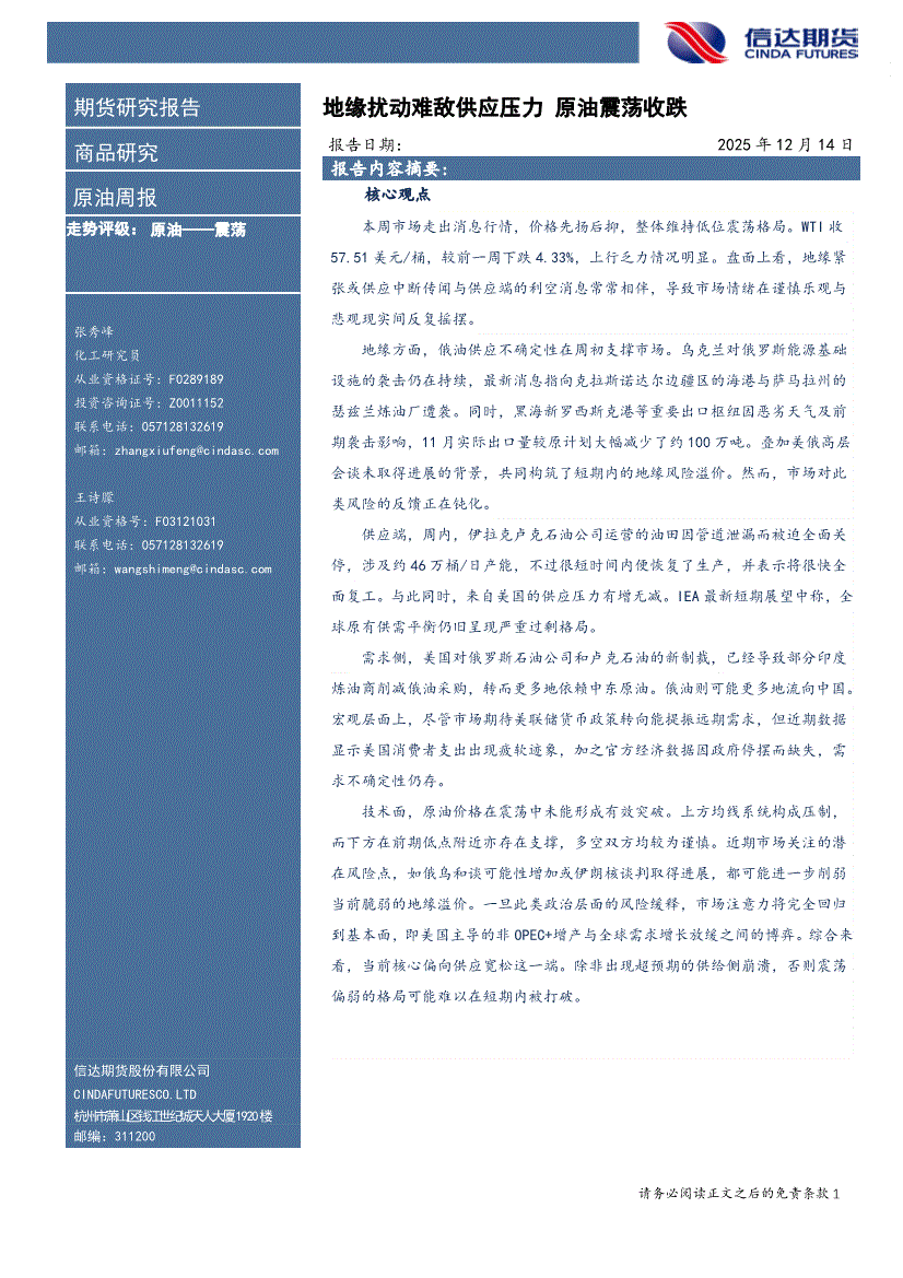 信达期货-原油周报:地缘扰动难敌供应压力,原油震荡收跌-251214