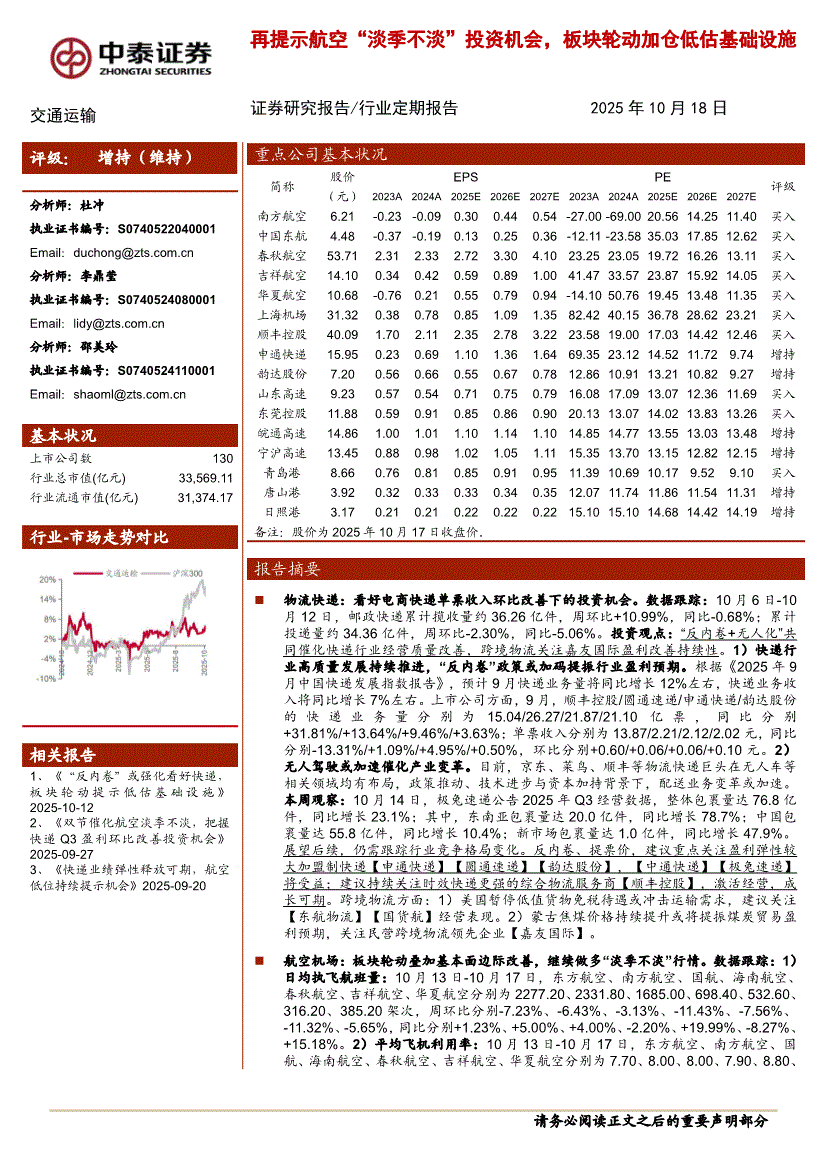 交通运输行业:中泰证券-交通运输行业:再提示航空“淡季不淡”投资机会,板块轮动加仓低估基础设施-251018