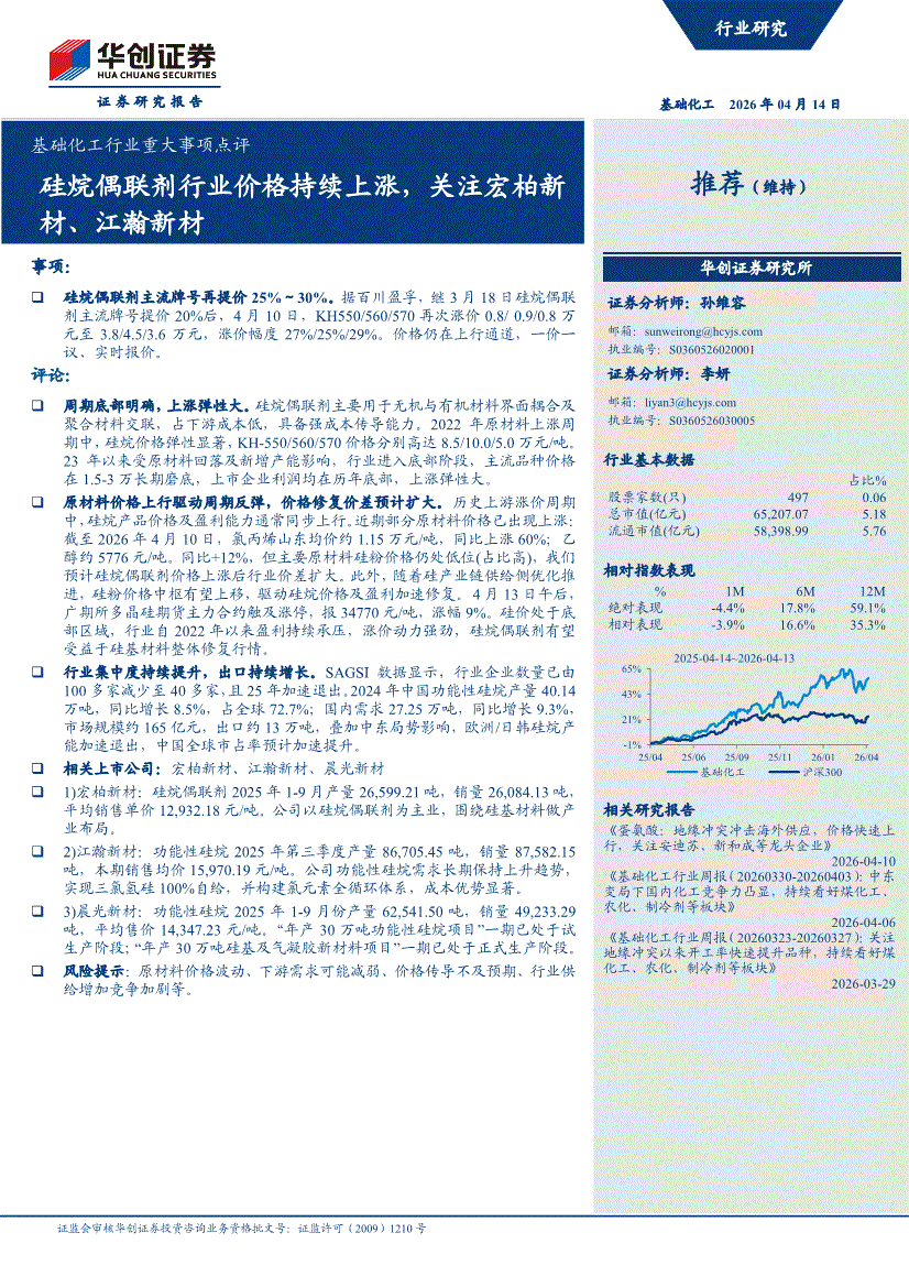 基础化工行业:华创证券-基础化工行业重大事项点评:硅烷偶联剂行业价格持续上涨,关注宏柏新材、江瀚新材-260414