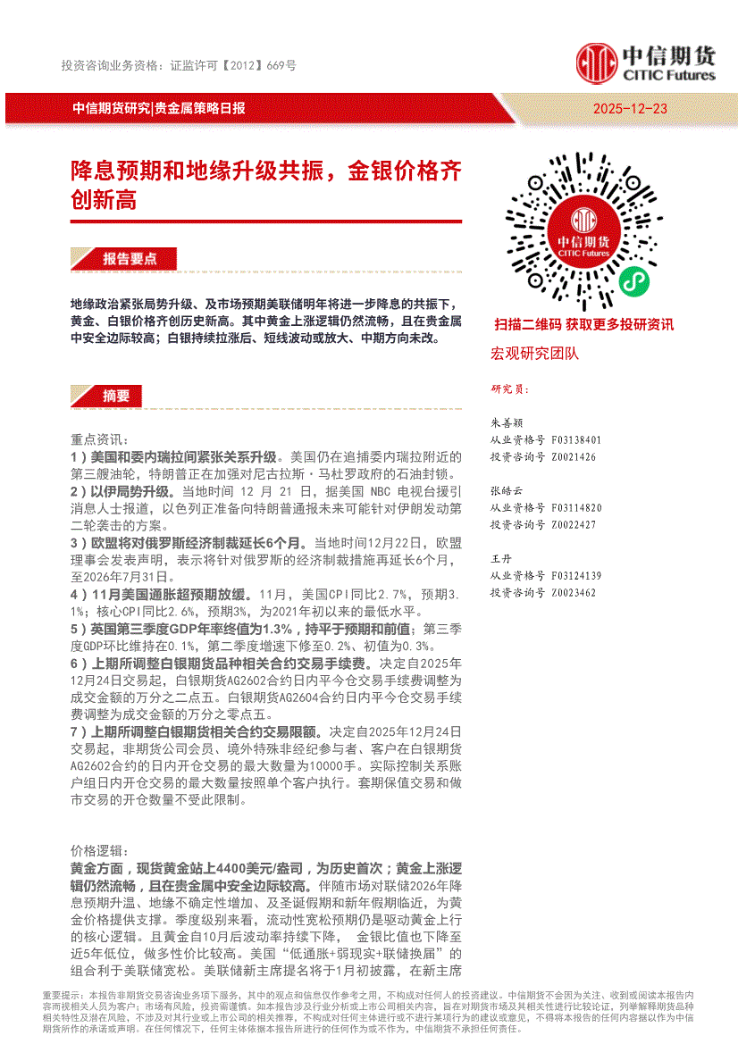 中信期货-贵金属策略日报:降息预期和地缘升级共振,金银价格齐创新高-251223