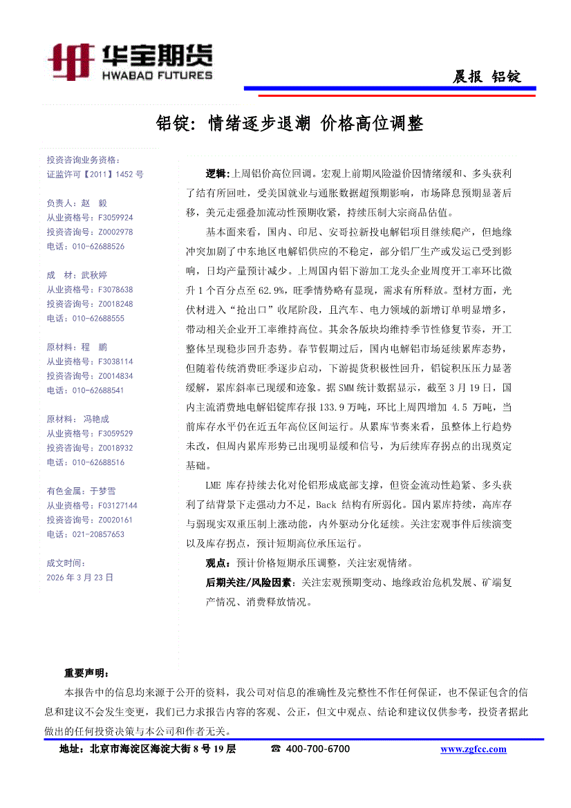 华宝期货-铝锭:情绪逐步退潮,价格高位调整-260323