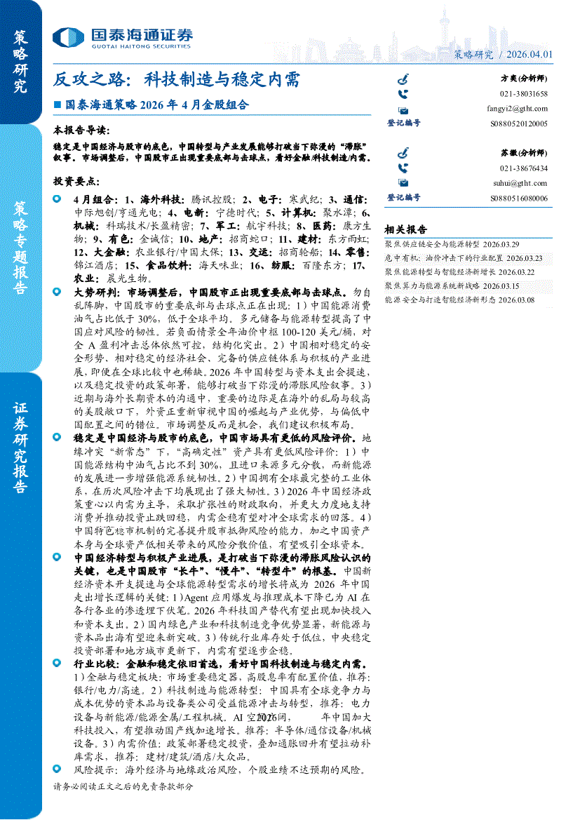 国泰海通证券-策略2026年4月金股组合:反攻之路,科技制造与稳定内需-260401