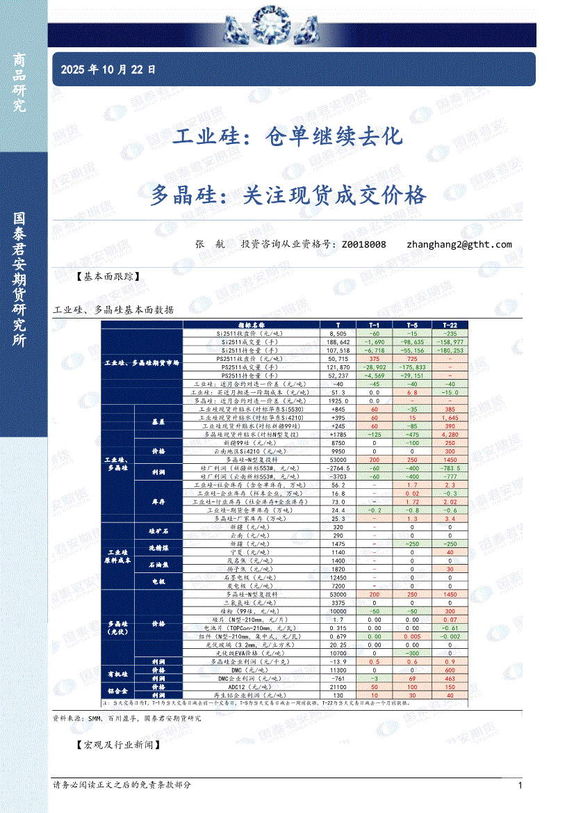 国泰君安期货-工业硅:仓单继续去化,多晶硅,关注现货成交价格-251022