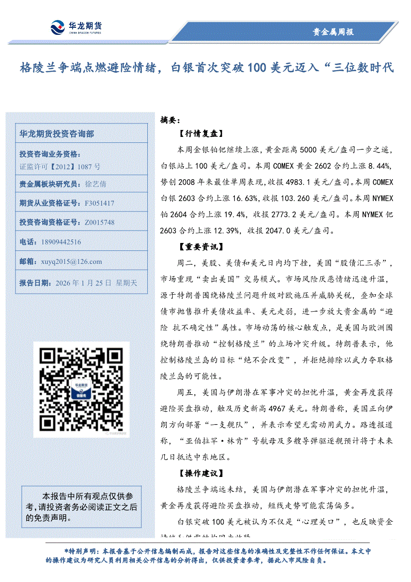 华龙期货-贵金属周报:格陵兰争端点燃避险情绪,白银首次突破100美元迈入“三位数时代”-260125