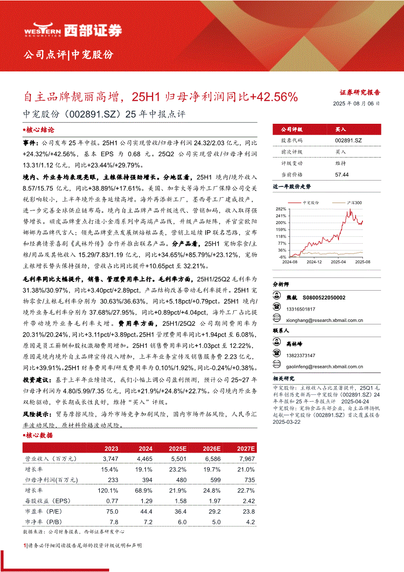 中宠股份:西部证券-中宠股份-002891-25年中报点评:自主品牌靓丽高增,25H1归母净利润同比+42.56%-250806