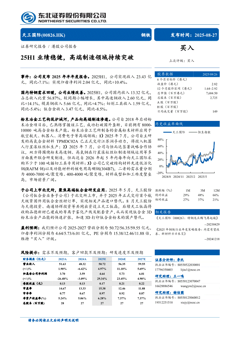天工国际:东北证券-天工国际-0826.HK-25H1业绩稳健,高端制造领域持续突破-250827