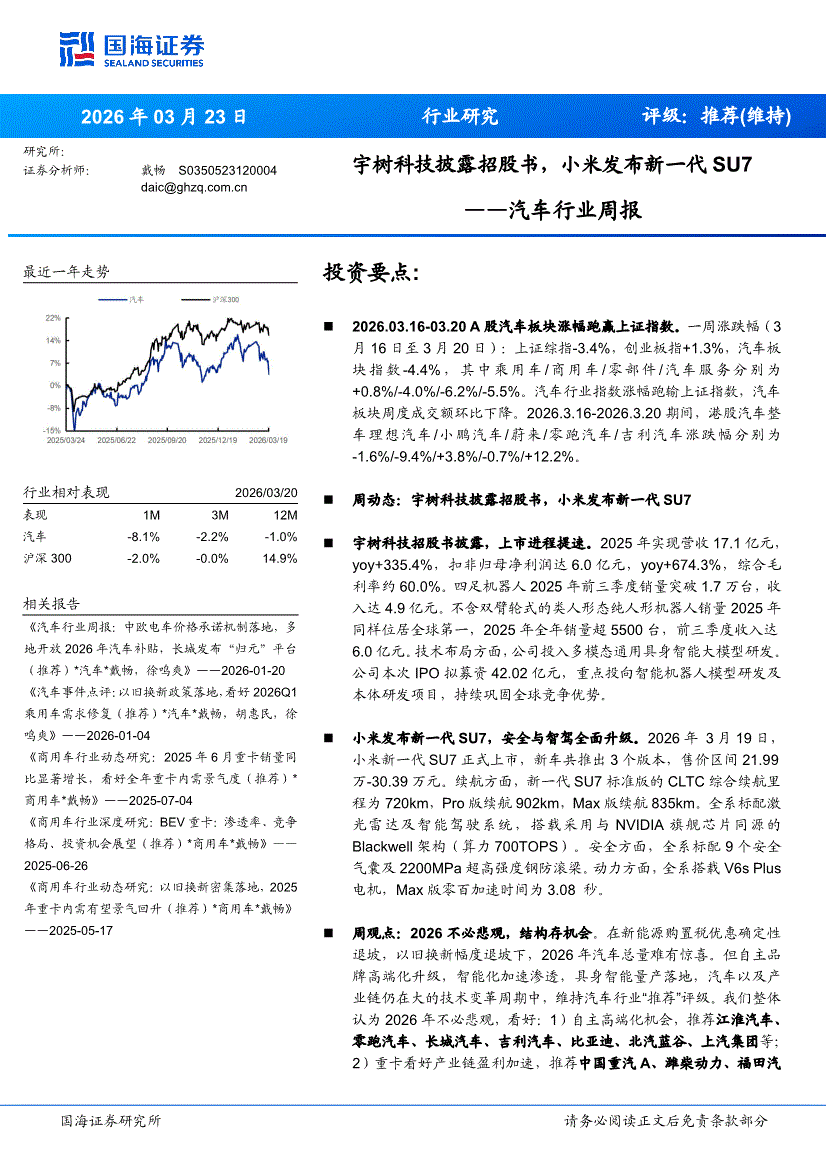 汽车行业:国海证券-汽车行业周报:宇树科技披露招股书,小米发布新一代SU7-260323
