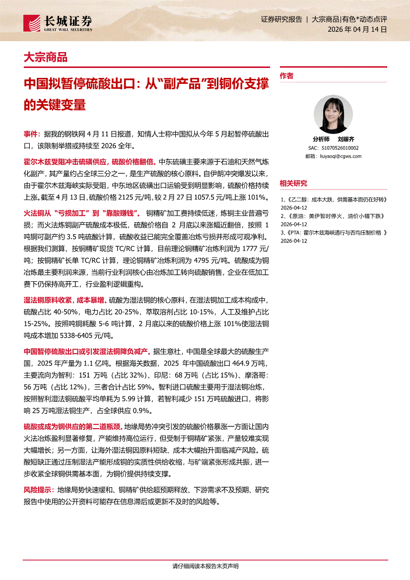 长城证券-大宗商品:中国拟暂停硫酸出口,从“副产品”到铜价支撑的关键变量-260414