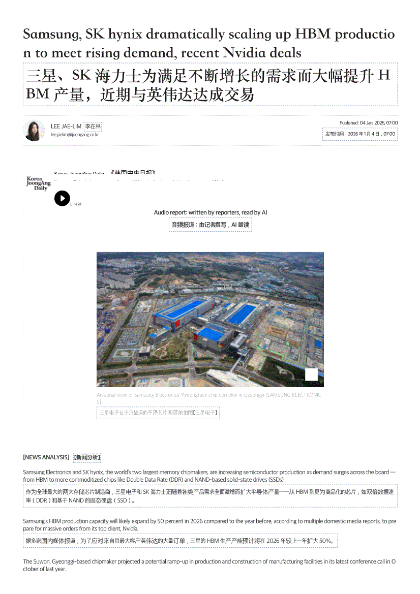 韩国中央日报-三星、SK海力士大幅扩大HBM产量以满足不断增长的需求,近期与英伟达达成交易-260104