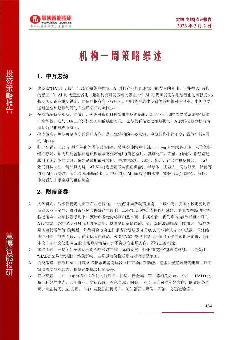 慧博智能投研-机构周策略:机构观点及行业配置-260301