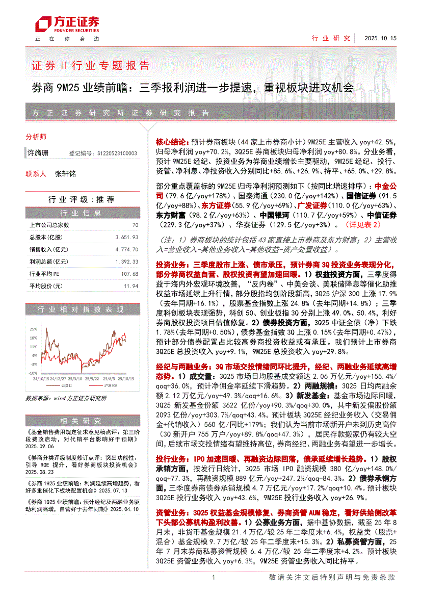 证券行业:方正证券-证券Ⅱ行业专题报告 :券商9M25业绩前瞻,三季报利润进一步提速,重视板块进攻机会-251015