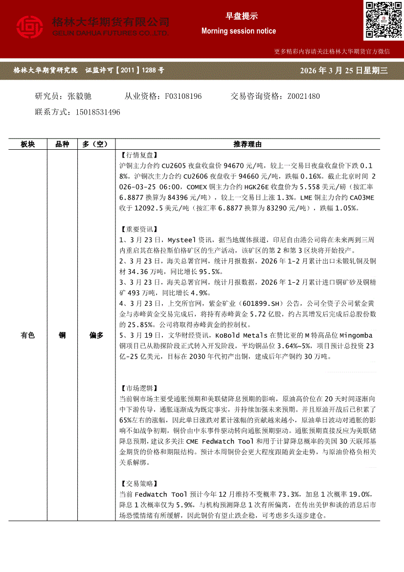 格林大华期货-铜早盘提示-260326