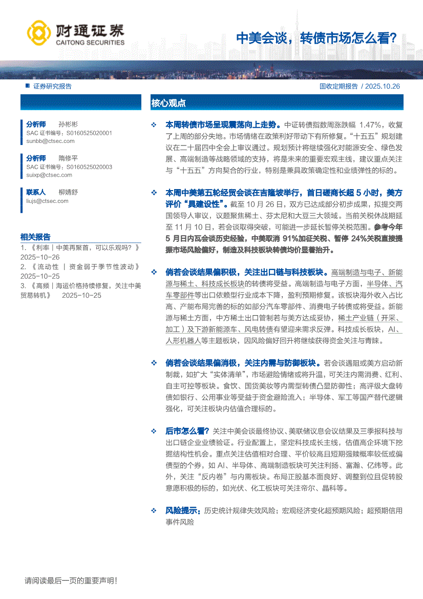 财通证券-中美会谈,转债市场怎么看?-251026