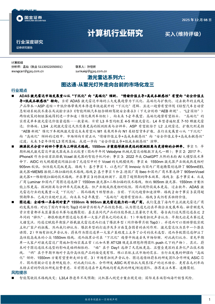 计算机行业:国金证券-计算机行业研究:激光雷达系列六,图达通~从聚光灯外走向台前的市场化龙三-251208