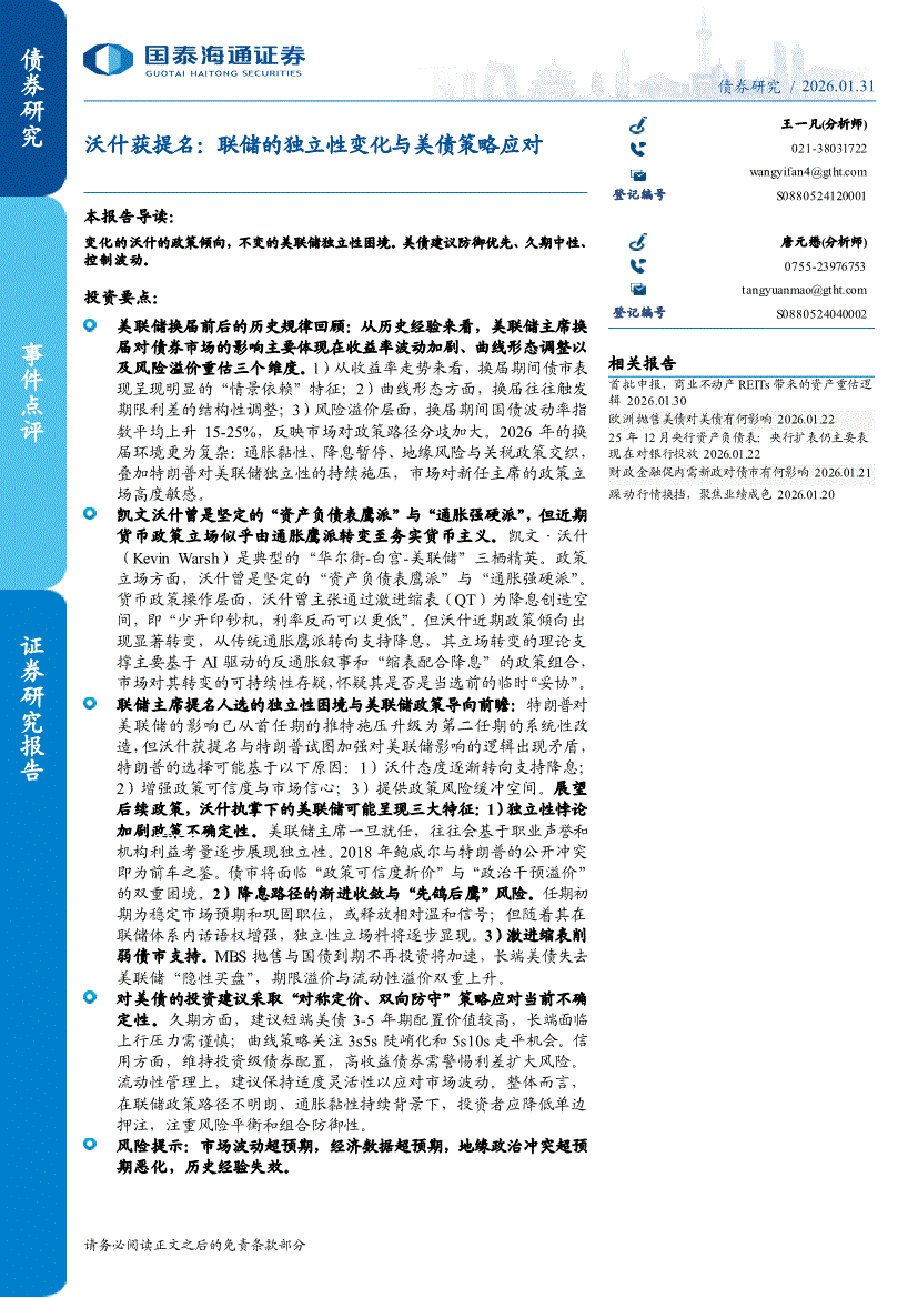 国泰海通证券-沃什获提名:联储的独立性变化与美债策略应对-260131