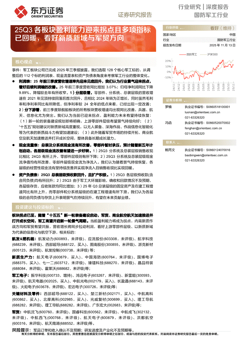 国防军工行业:东方证券-国防军工行业:25Q3各板块盈利能力迎来拐点且多项指标已回暖,看好新质新域与军贸方向-251113
