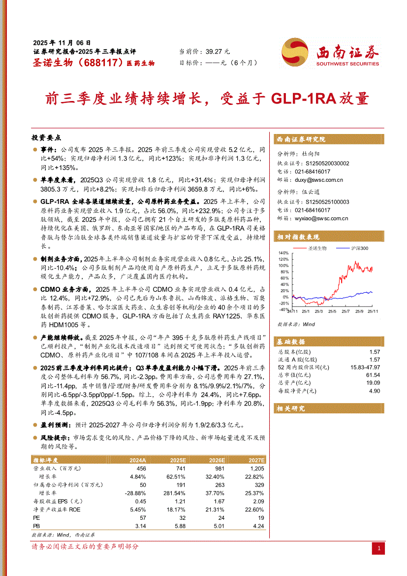 圣诺生物:西南证券-圣诺生物-688117-前三季度业绩持续增长,受益于GLP~1RA放量-251106
