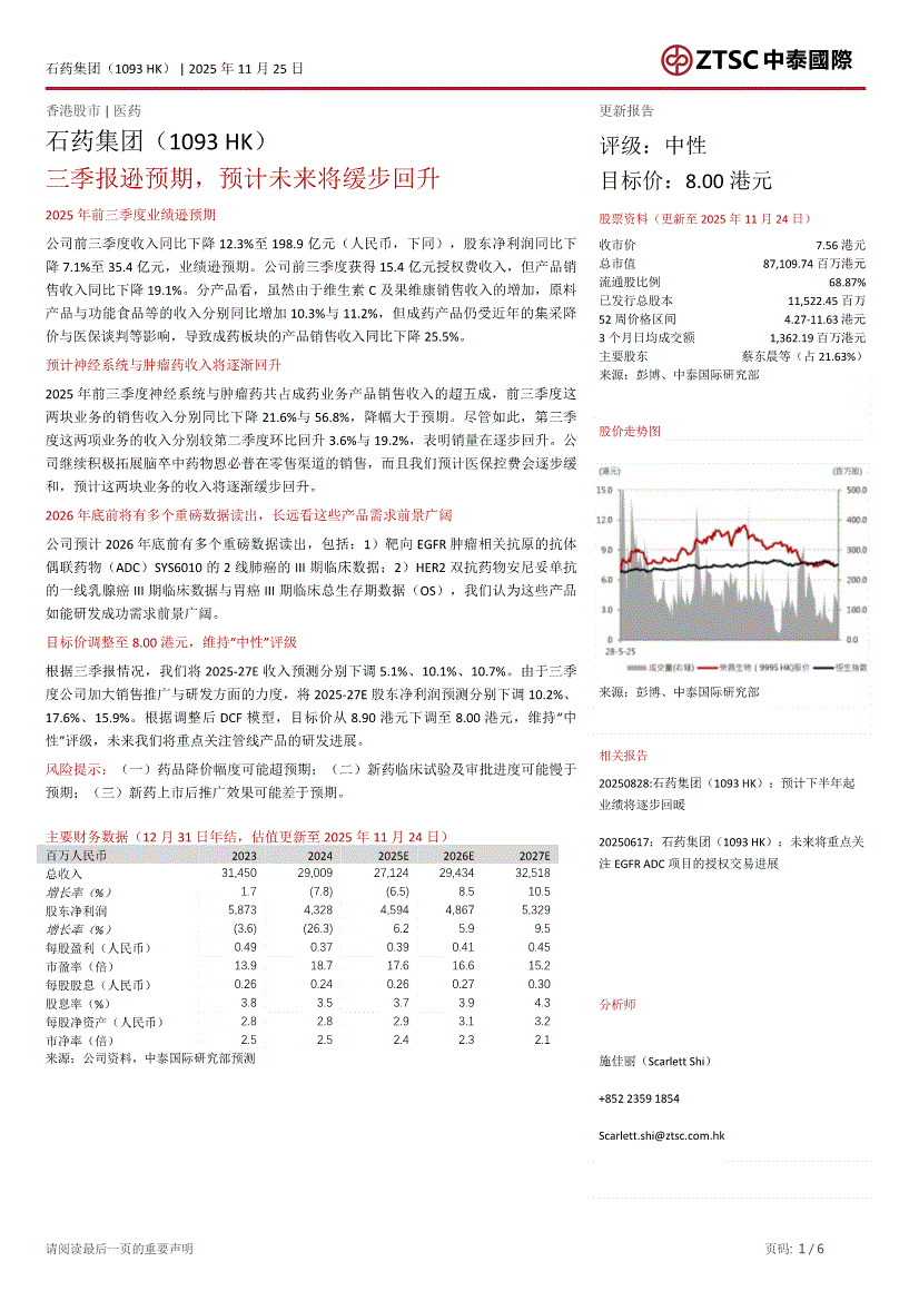 石药集团:中泰国际-石药集团-1093.HK-三季报逊预期,预计未来将缓步回升-251125