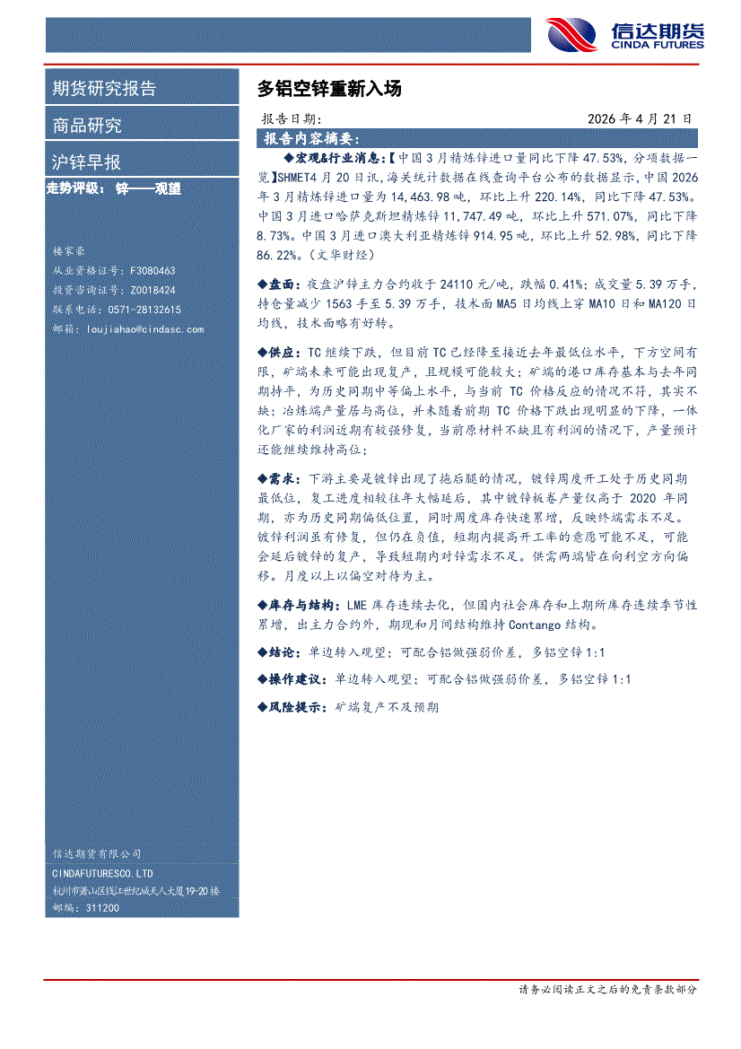 信达期货-沪锌早报:多铝空锌重新入场-260421