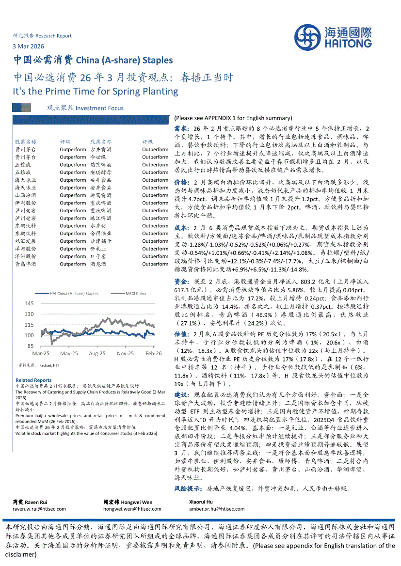 必选消费行业:海通国际-中国必选消费行业26年3月投资观点:春播正当时-260303