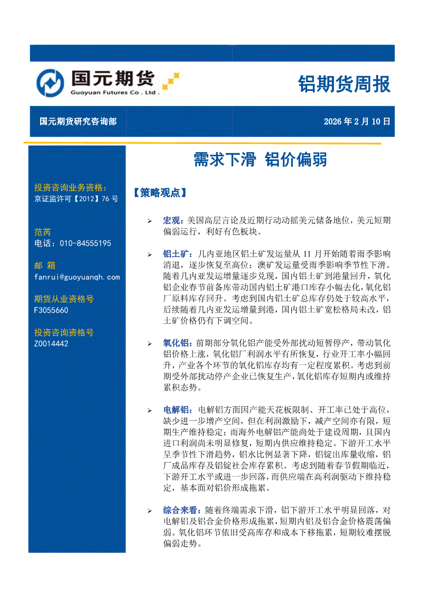 国元期货-铝期货周报:需求下滑,铝价偏弱-260210