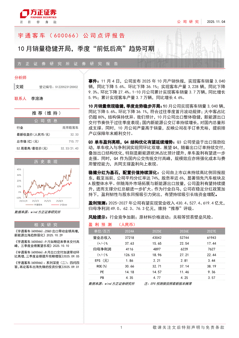 宇通客车:方正证券-宇通客车-600066-公司点评报告:10月销量稳健开局,季度“前低后高”趋势可期-251104