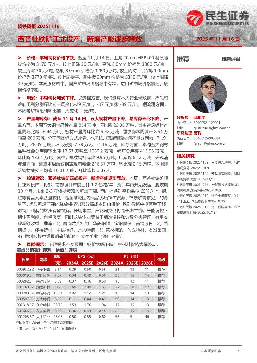 钢铁行业:民生证券-钢铁行业周报:西芒杜铁矿正式投产,新增产能逐步释放-251116