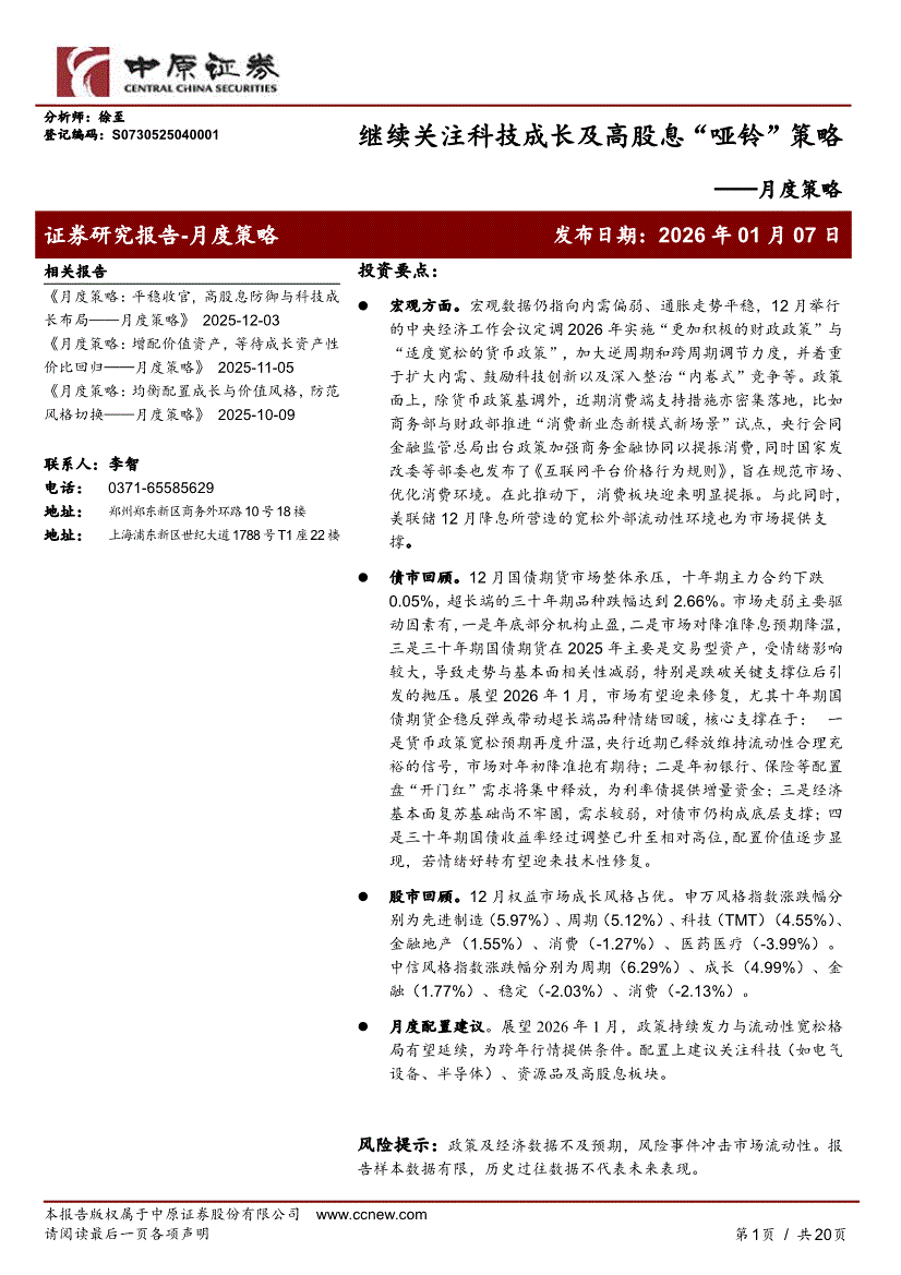 中原证券-月度策略:继续关注科技成长及高股息“哑铃”策略-260107