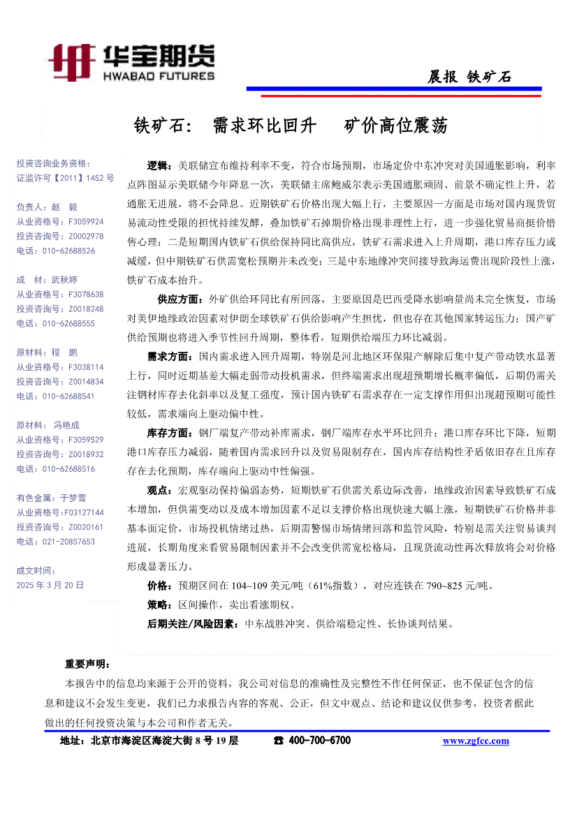 华宝期货-铁矿石晨报:需求环比回升,矿价高位震荡-260320