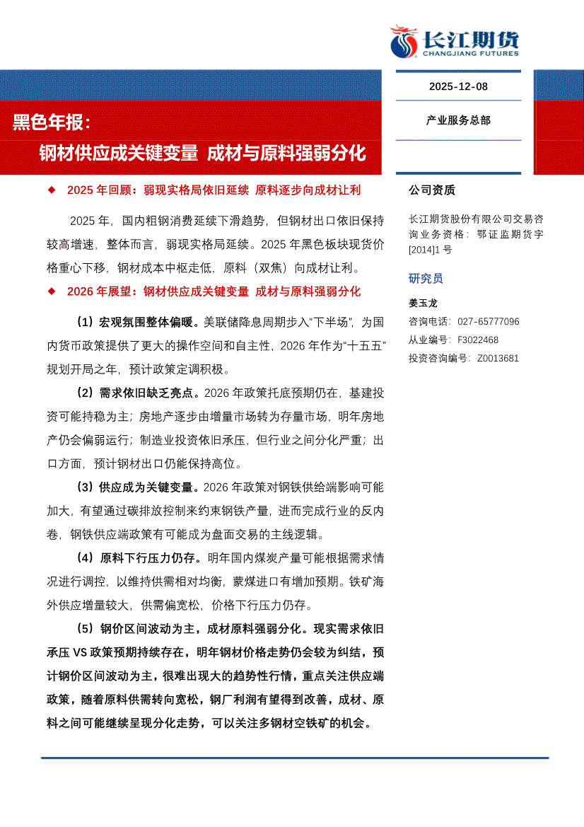 长江期货-黑色年报:钢材供应成关键变量,成材与原料强弱分化-251208