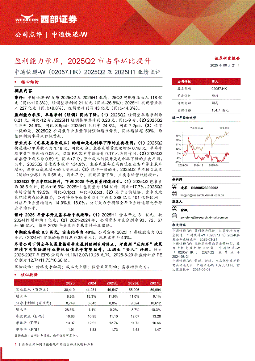 中通快递~W:西部证券-中通快递~W-2057.HK-2025Q2及2025H1业绩点评:盈利能力承压,2025Q2市占率环比提升-250821