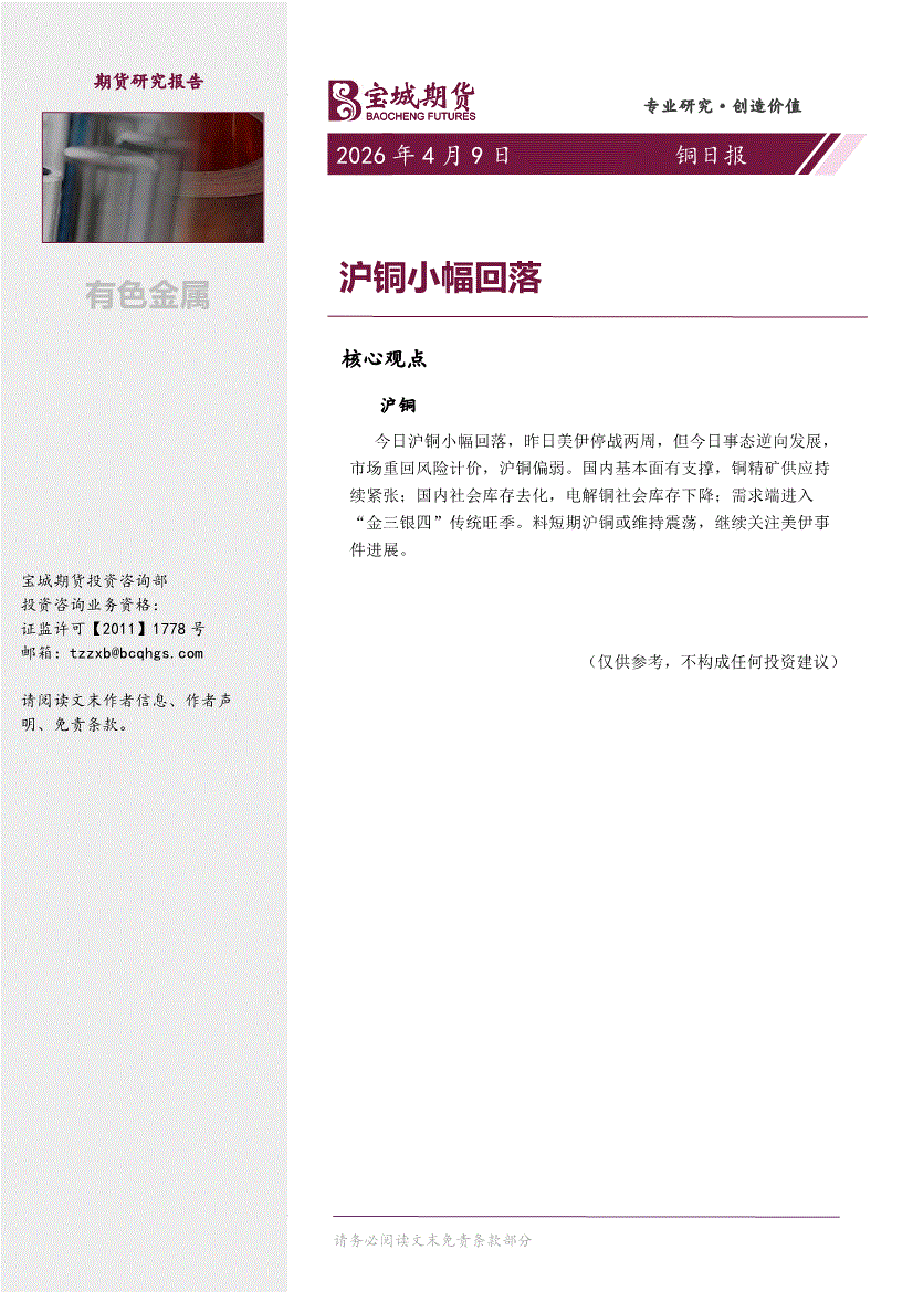 宝城期货-铜日报:沪铜小幅回落-260409