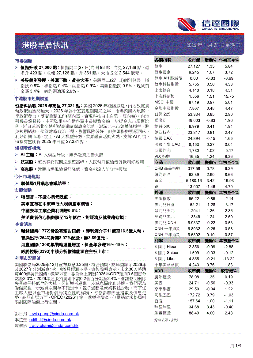 信达国际-港股早晨快讯-260128