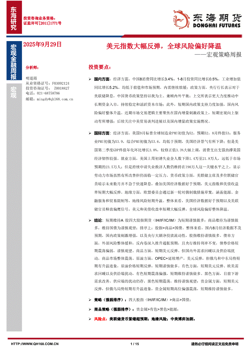 东海期货-宏观策略周报:美元指数大幅反弹,全球风险偏好降温-250929