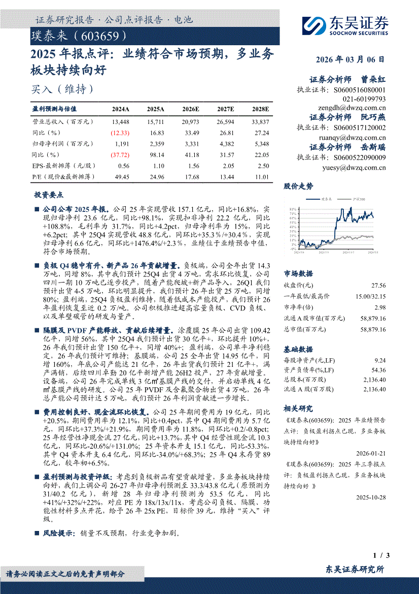 璞泰来:东吴证券-璞泰来-603659-2025年报点评:业绩符合市场预期,多业务板块持续向好-260306