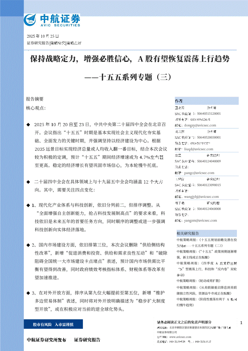 中航证券-十五五系列专题(三):保持战略定力,增强必胜信心,A股有望恢复震荡上行趋势-251025